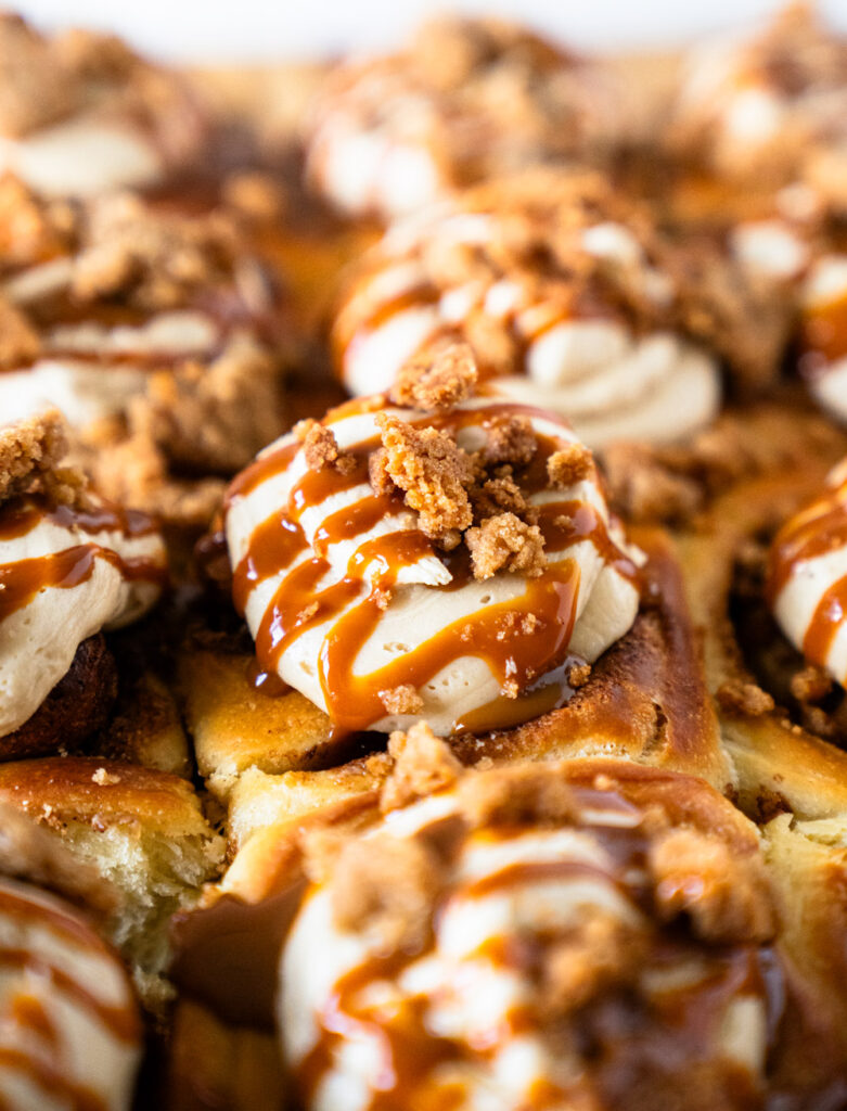 These Dulce de Leche Cinnamon Rolls are wonderfully soft, gooey, and topped with a brown sugar buttercream, rich caramel-like drizzle, and a crunchy streusel. Think classic cinnamon rolls - but taken to the next level with a dulce de leche filling and crumble topping.