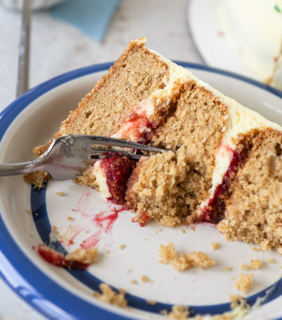 Graham Cracker Cake with cake batter frosting, a buttery graham cracker crust baked right into each layer, and a jammy raspberry filling that makes the whole thing taste like your favorite ice cream flavor decided to grow up.