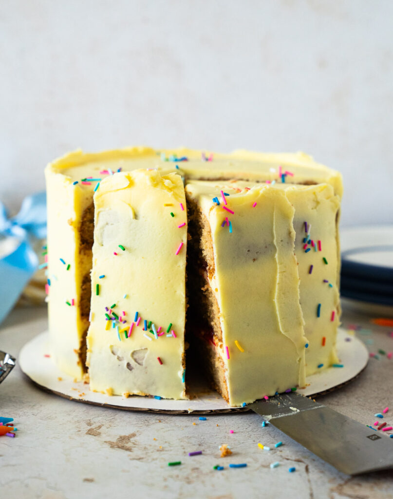 - Once the crumb coat is set, finish frosting and decorating the cake with the remaining cake batter buttercream. Throw a few rainbow sprinkles on it and serve at room temperature.rainbow sprinkles