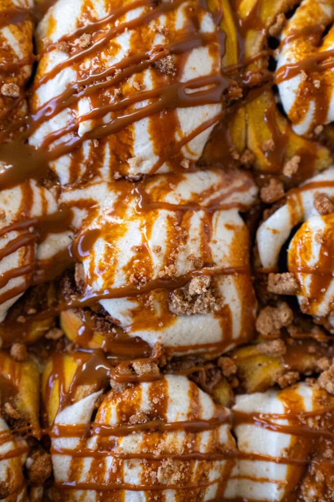 - Drizzle the homemade caramel sauce over the frosted rolls using a spoon or piping bag. Serve warm or at room temperature.