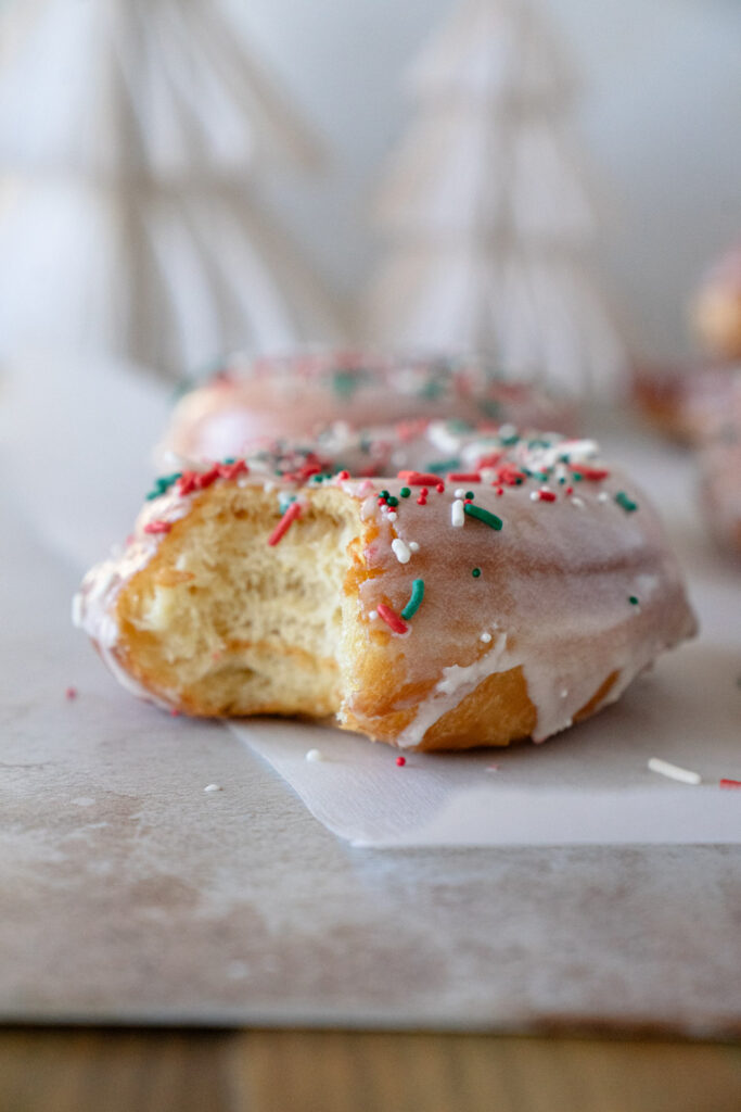 - Dip and decorate: Dip the tops of warm donuts in glaze, let the excess drip off onto the cookie sheet, and add Christmas sprinkles. Let set 15-20 minutes before serving.
