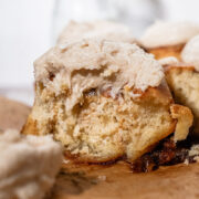 Once the cinnamon rolls have cooled slightly, spread the brown butter cream cheese buttercream evenly over the tops of the rolls. I did dollops with a piping bag for a pretty look, but you can do whatever you like!
